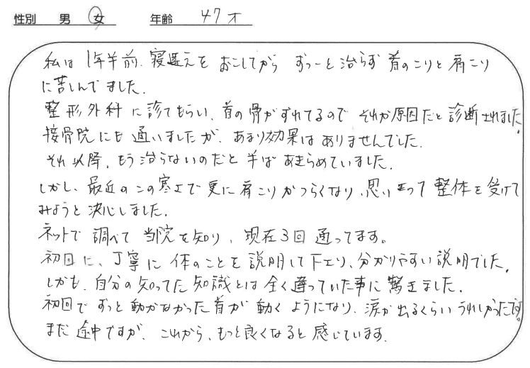 私は1年前、寝違えをおこしてからずっーと治らず首のこりと肩こりに苦しんでいました。整形外科に診てもらい首の骨がずれてるのでそれが原因だと診断されました。接骨院にも通いましたがあまり効果はありませんでした。それ以降もう治らないのだと半ばあきらめていました。しかし最近のこの寒さでさらに肩こりがつらくなり思い切って整体を受けてみようと決心しました。